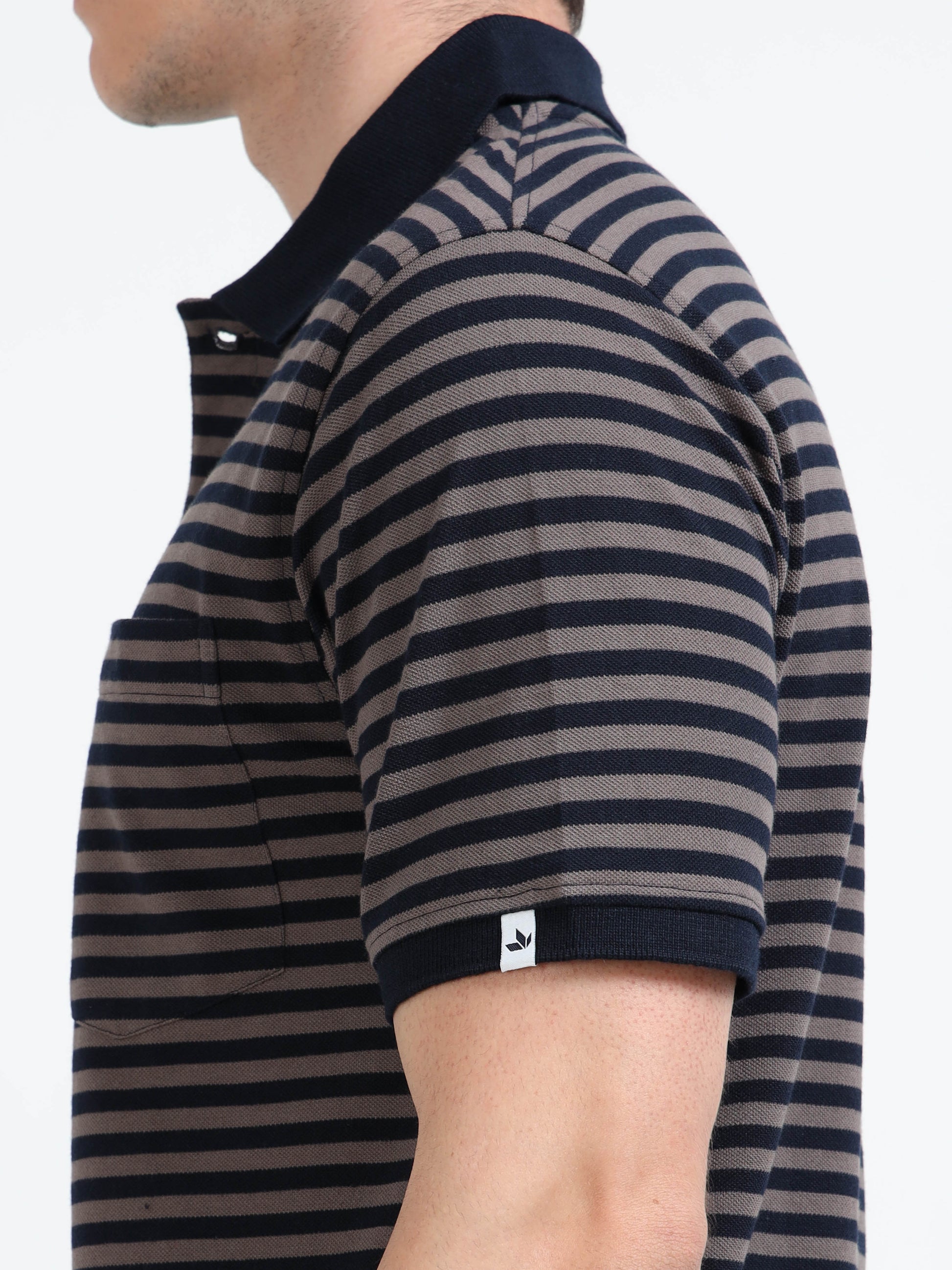 Earthy tones meet classic styling in this Men's Brown Polo T-shirt. Designed with bold black, grey, and white horizontal stripes across a warm brown base, this tee adds a grounded yet modern feel to your casual wardrobe. Made from 100% breathable cotton, it features a ribbed collar, two-button placket, and chest pocket—perfect for everyday wear with a touch of personality.