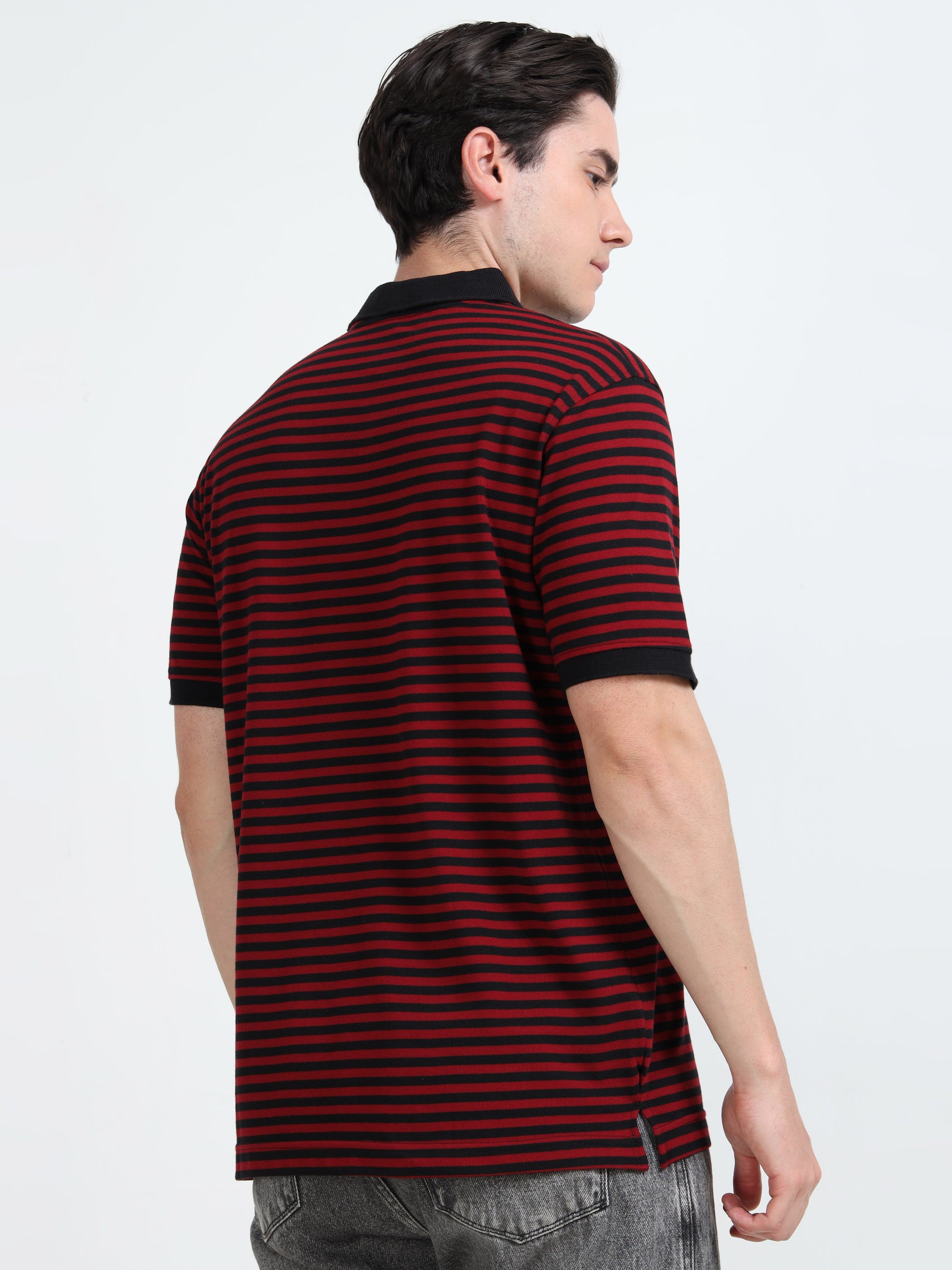 Bold and classic come together in this Men's Red Polo T-shirt, featuring striking black horizontal stripes across a vivid red base. Made from 100% breathable cotton, it ensures all-day comfort with a polished, timeless look. With a ribbed collar, two-button placket, and chest pocket, this polo brings standout style to your everyday rotation.