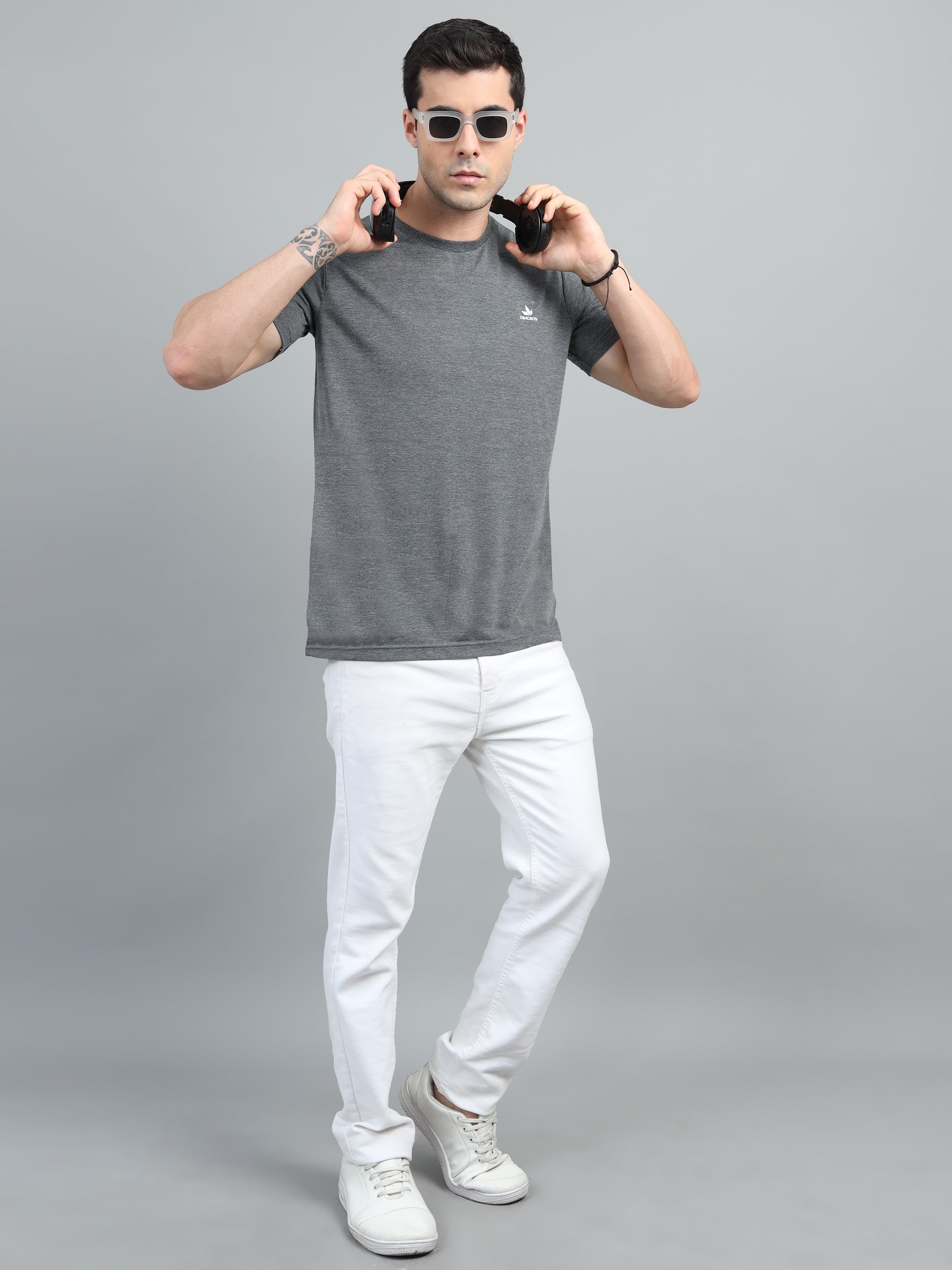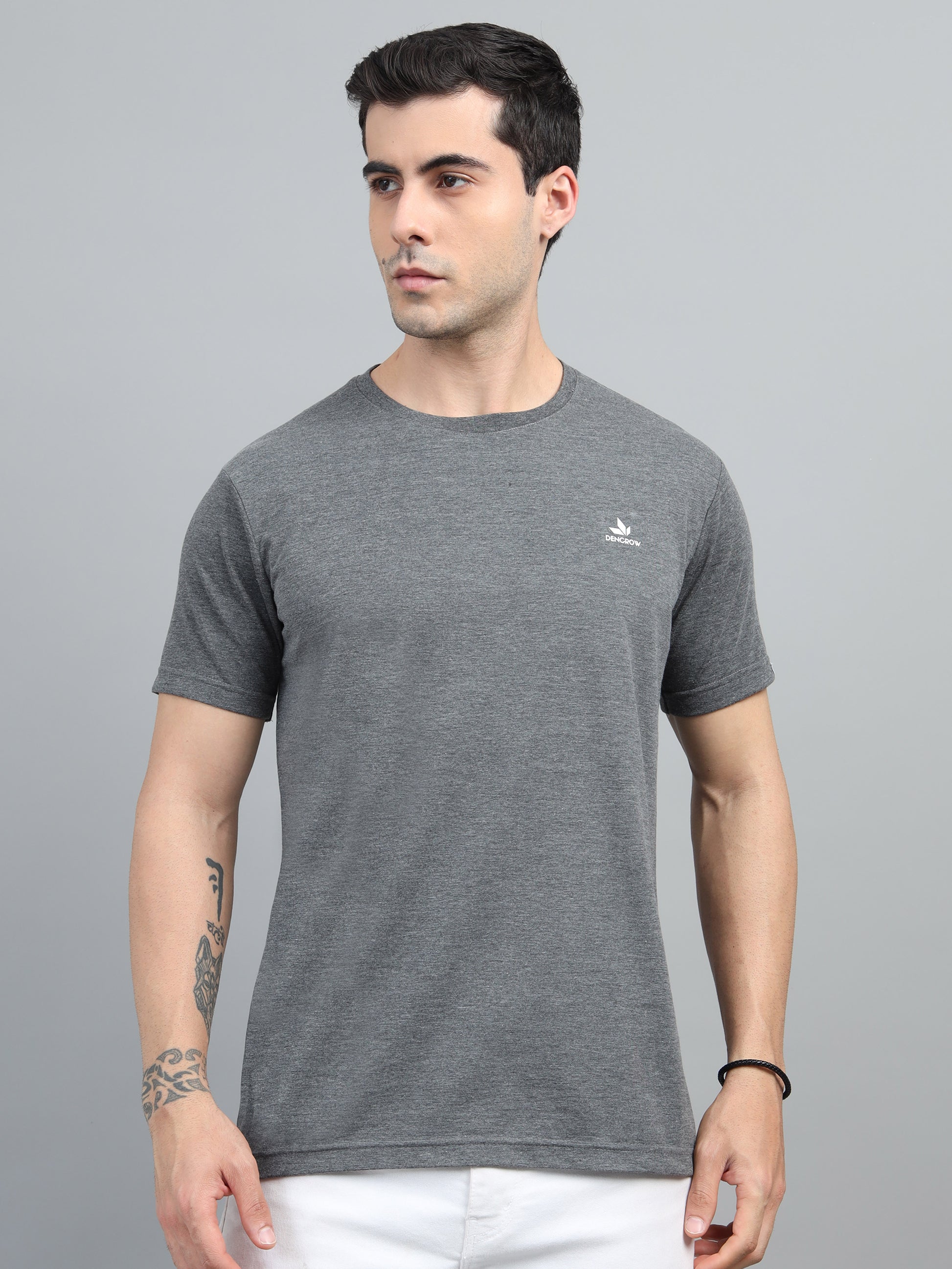 Versatile and understated, this dark grey round neck t-shirt brings effortless cool to your everyday lineup. Made from soft, breathable cotton, it features a regular fit and a clean silhouette that pairs well with anything—from joggers to jackets.