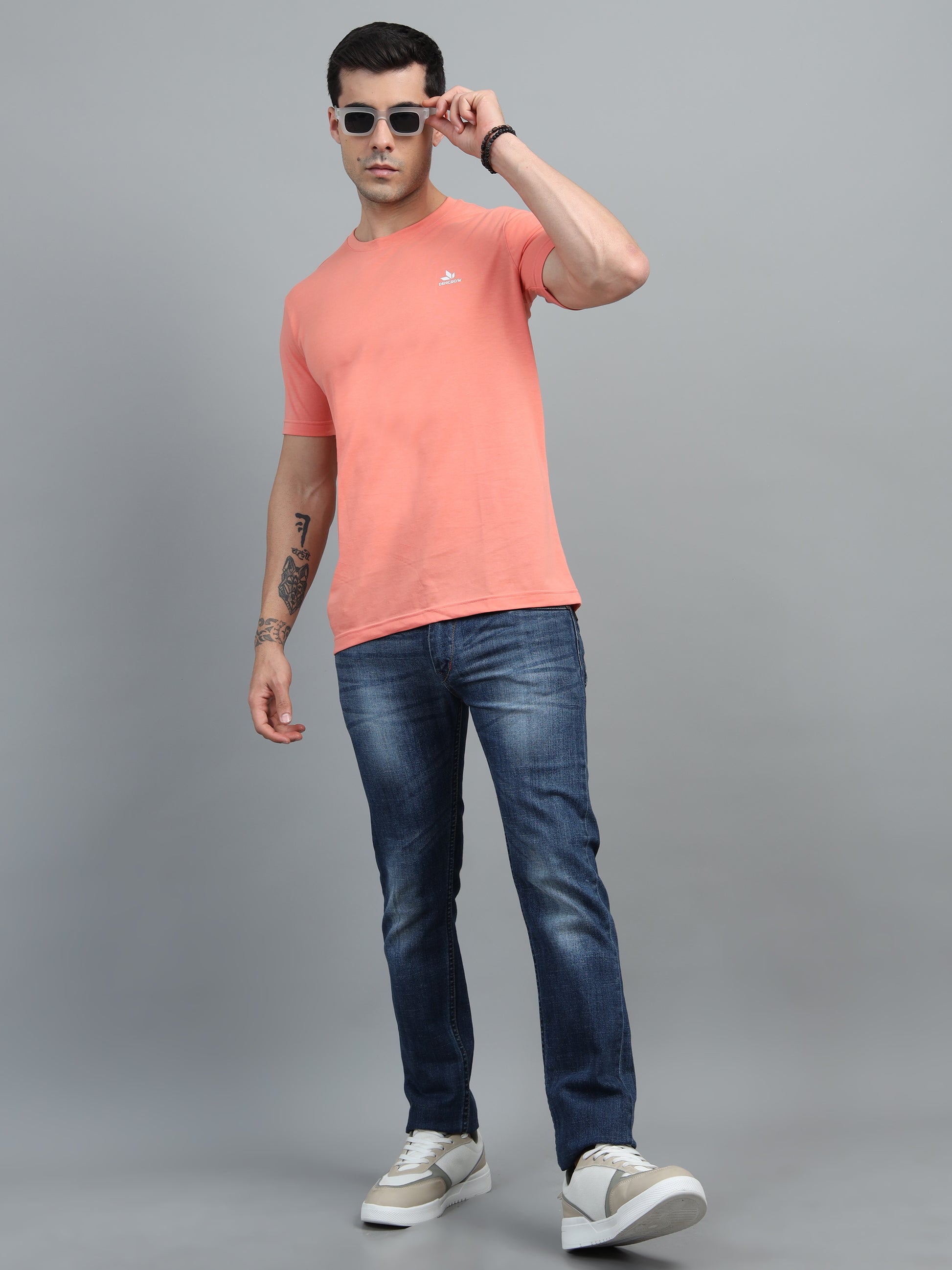 Add a fresh pop of color to your wardrobe with this salmon round neck t-shirt. Crafted from soft, breathable cotton, it offers a comfortable regular fit and a smooth finish. Subtle yet standout—perfect for easygoing days with a touch of style.
