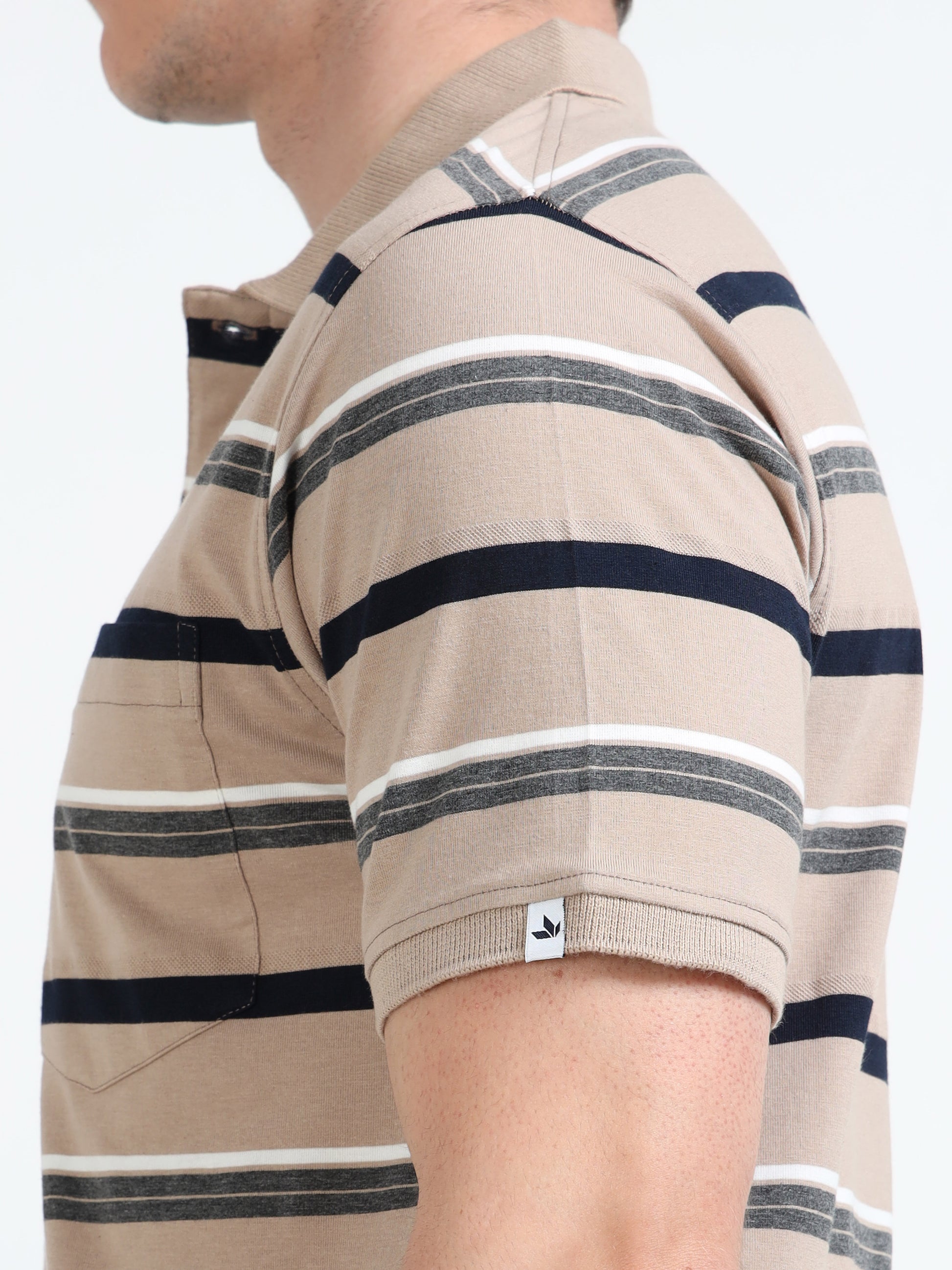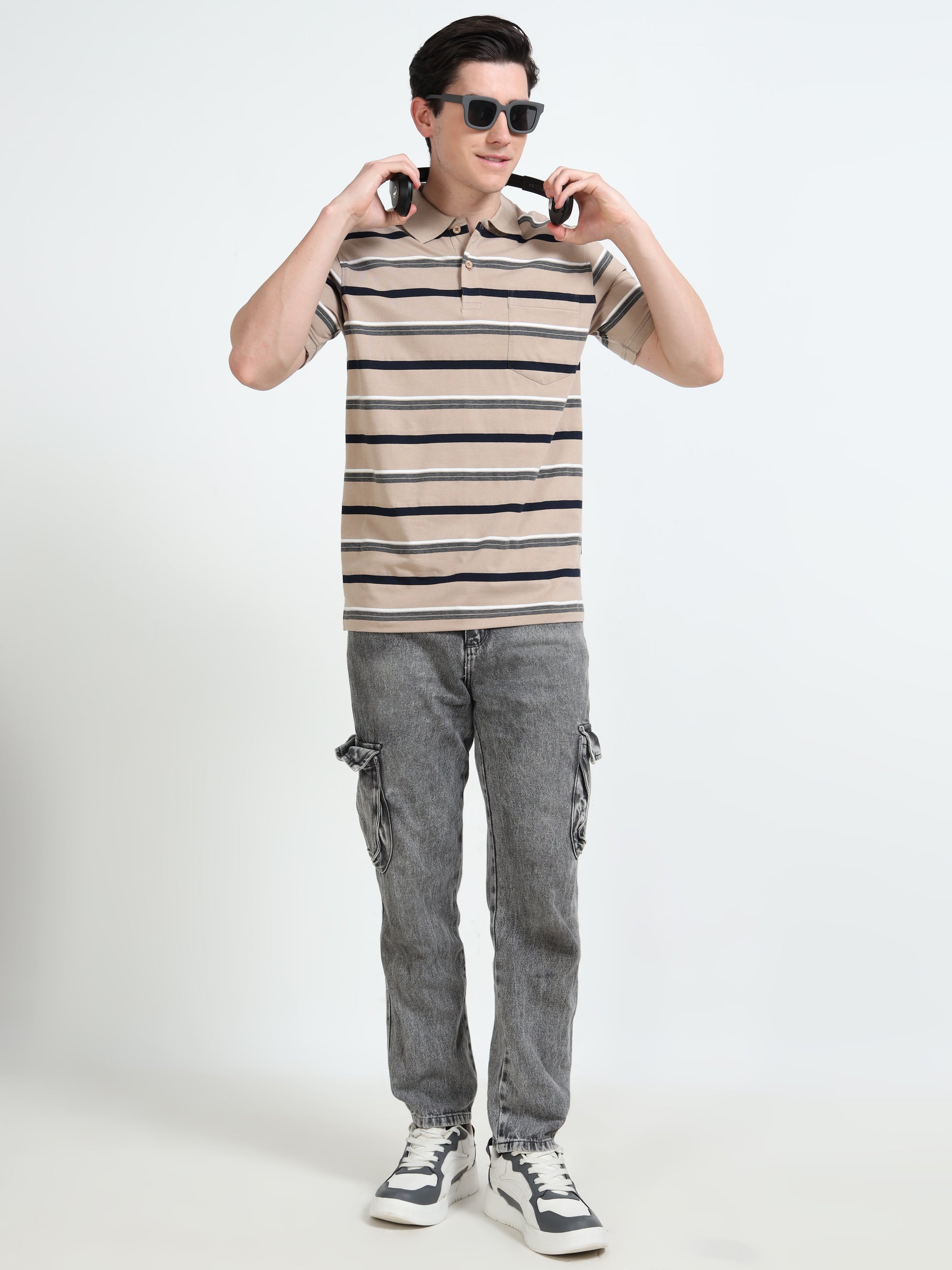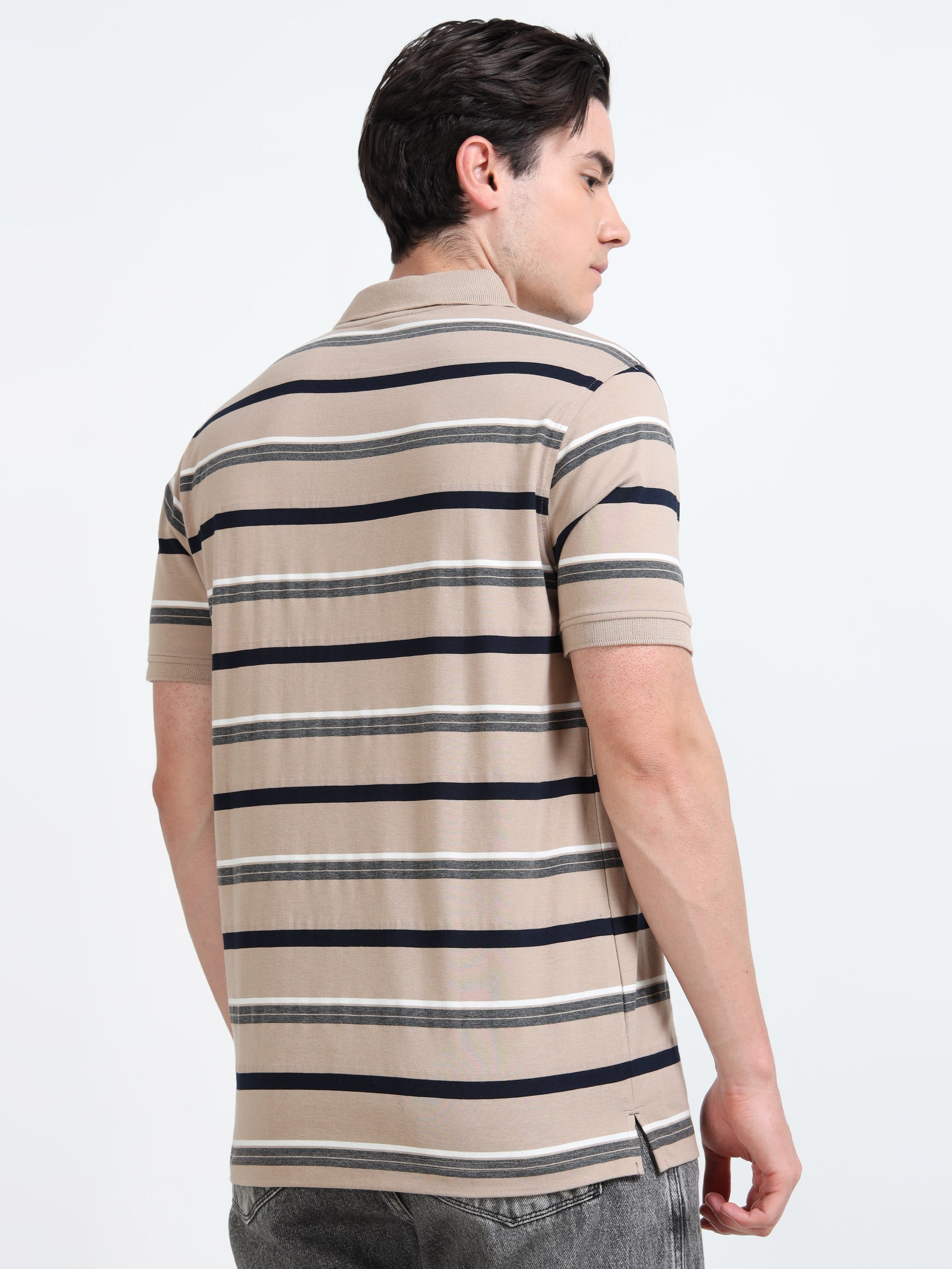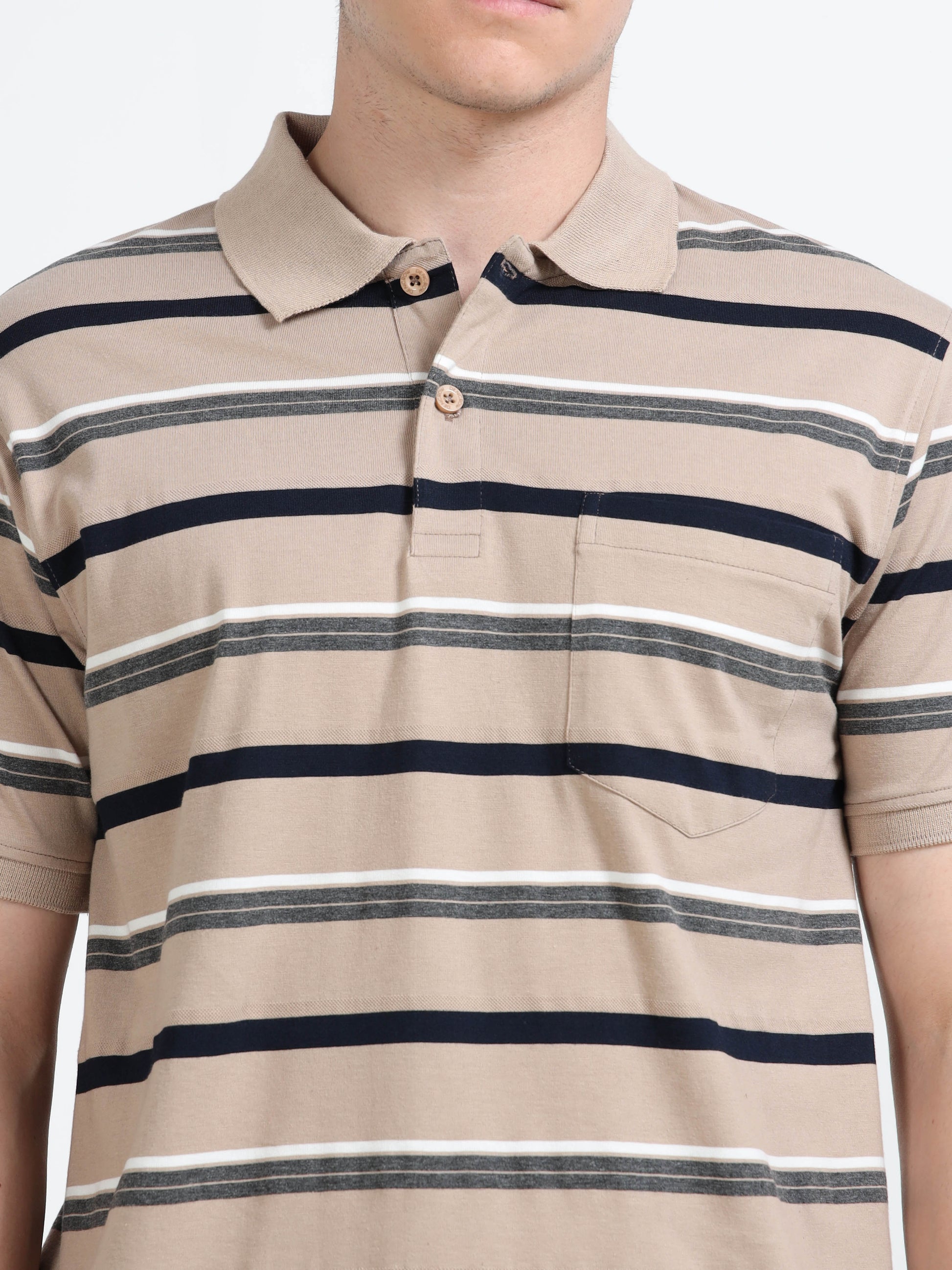 A perfect balance of subtle and striking, this Men's Beige Polo T-shirt features bold white and black horizontal stripes across a soft beige base. Made from 100% breathable cotton, it’s designed for all-day comfort with a clean, classic silhouette. Finished with a ribbed collar, two-button placket, and a chest pocket, this polo is your go-to for smart casual dressing.